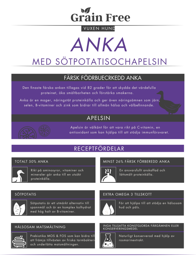 Grain Free Anka är ett smakrikt, spannmålsfritt helfoder för vuxna hundar som förtjänar det bästa från både natur och näring.