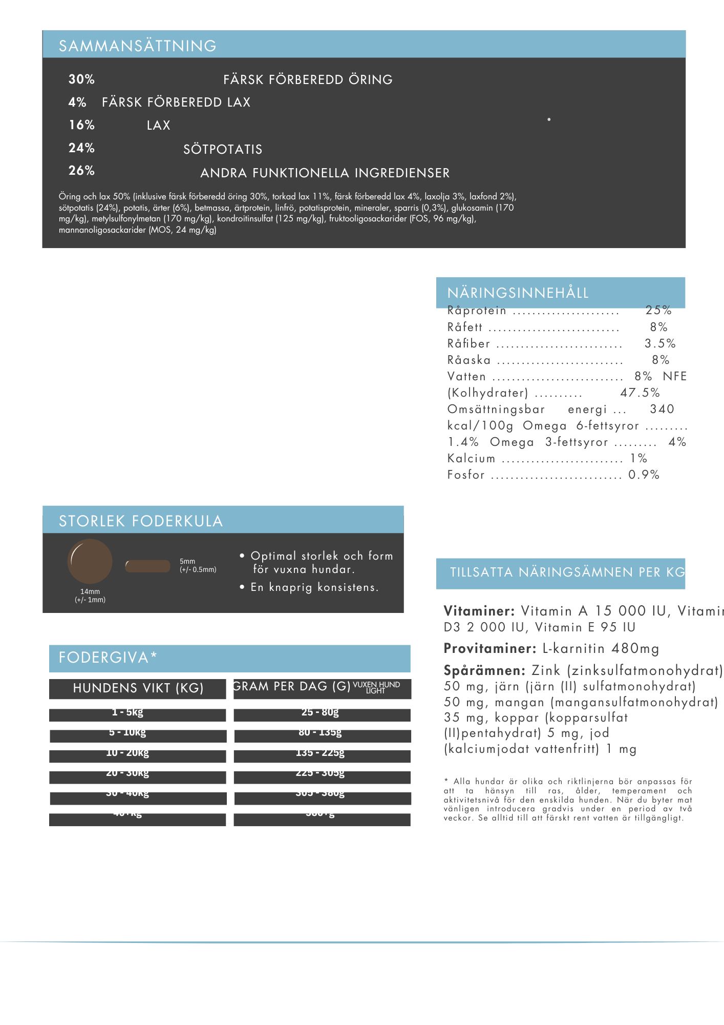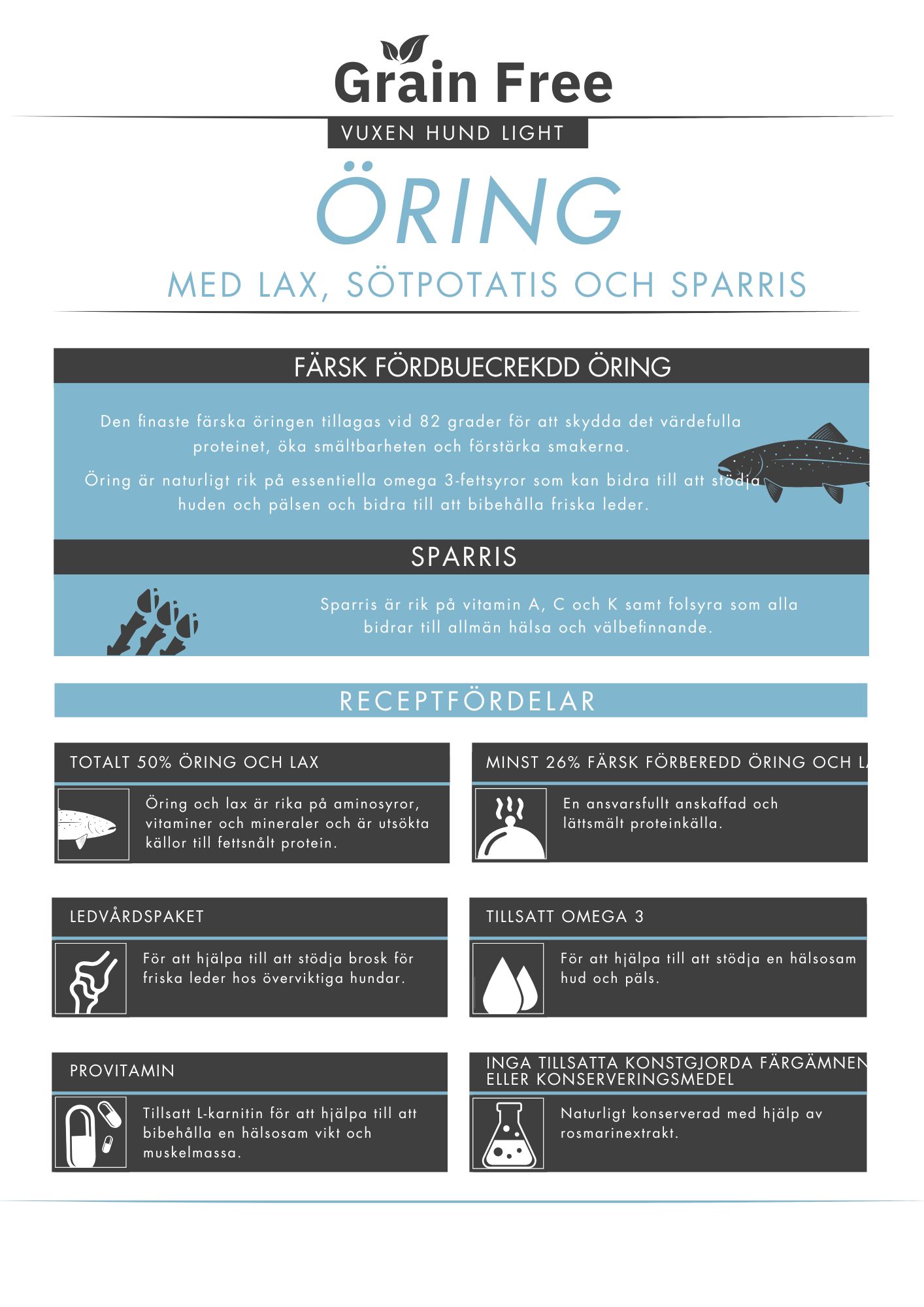 Vår nya Grain Free Light-variant med öring och lax är framtagen för hundar som behöver ett näringsrikt men lättsmält foder. Öringen tillagas varsamt vid 82 grader för att bevara alla naturliga näringsämnen och proteiner.